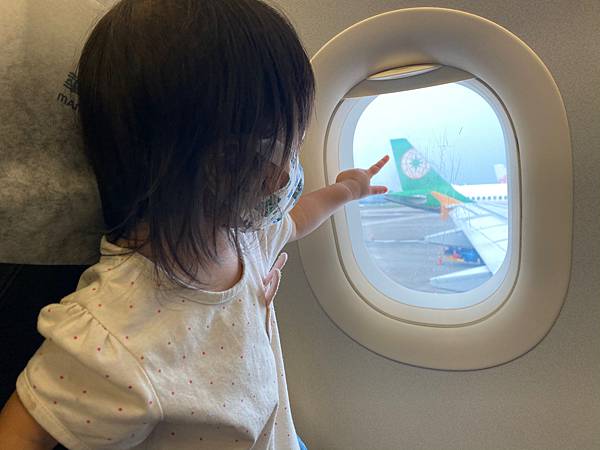這一趟旅行是提前慶祝小女兒生日!過了2歲就不是嬰兒,現在還能享受一下最高禮遇,下午17:45飛機,我們16點多到,買了高雅不貴的復興空廚麵包、鮭魚焗飯,孩子們肯定餓了,說好好吃喔!然後擠在一團吃東西。17:20要進到登記門,到場稍微愣了一下,班機延誤—因為地面作業延誤了15分鐘,18:00多飛18:45到澎湖機場。蠻幸運剛好旁邊沒有人,多了兩個座位運用,讓我家嬰兒享受好一會兒看窗時光,感覺很興奮很驚奇。